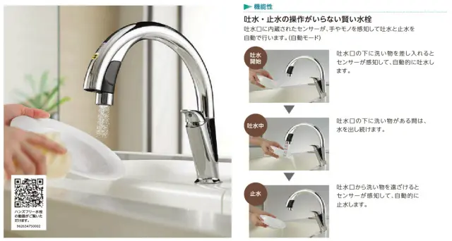 それは手をかざせばお湯や水が出て来る水栓で、手が汚れていてもレバーを汚さずに、水を出す事が出来ます。