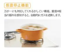 また感震停止機能は震度4以上の揺れが起きた場合、自動的にガスを停める機能です。機種によって搭載の有無が異なりますが、多くの機種で採用されています。