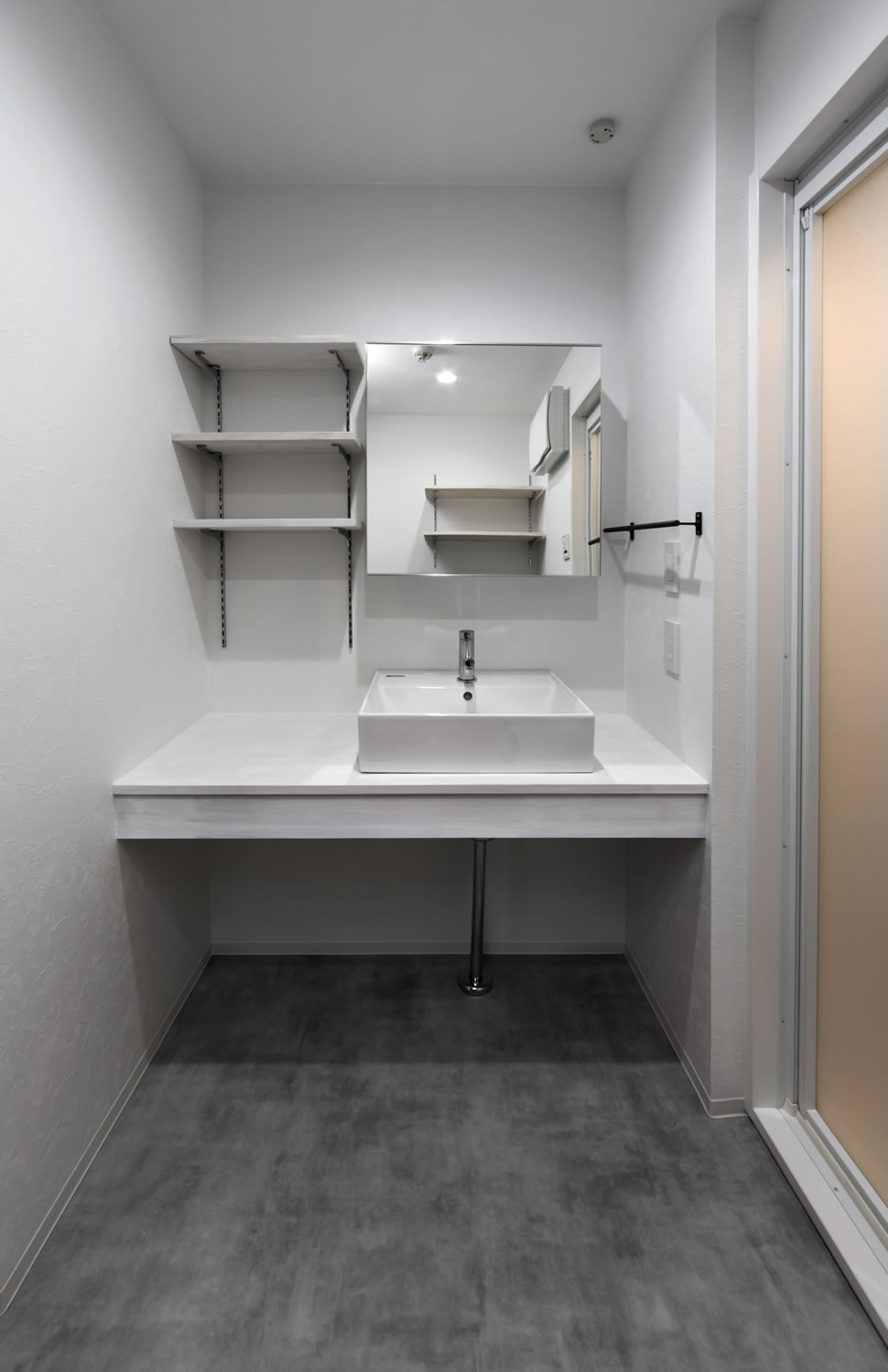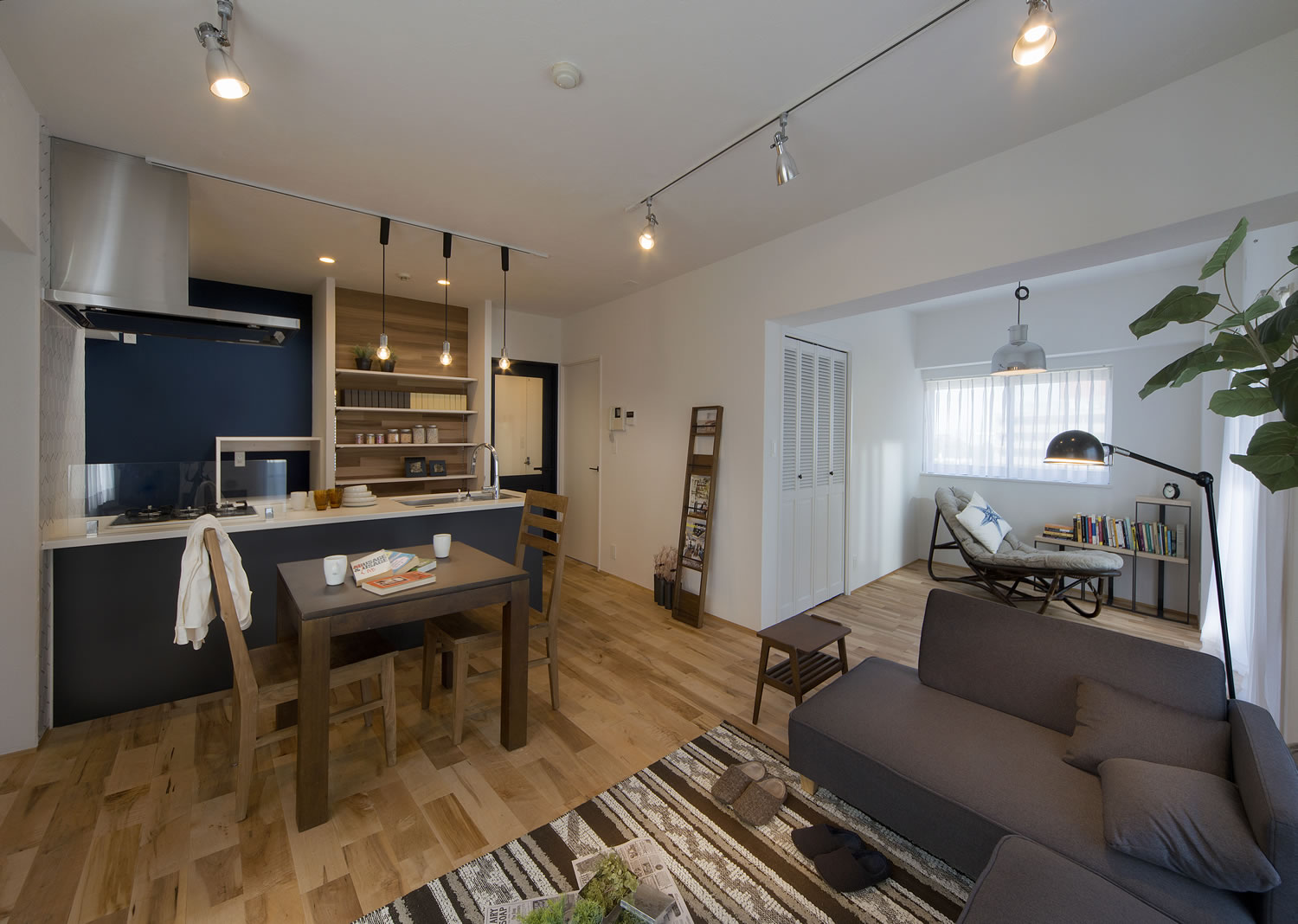 白を基調とした空間。正統派ネイビーでまとめたアクセントが上品さをプラスしてくれます。