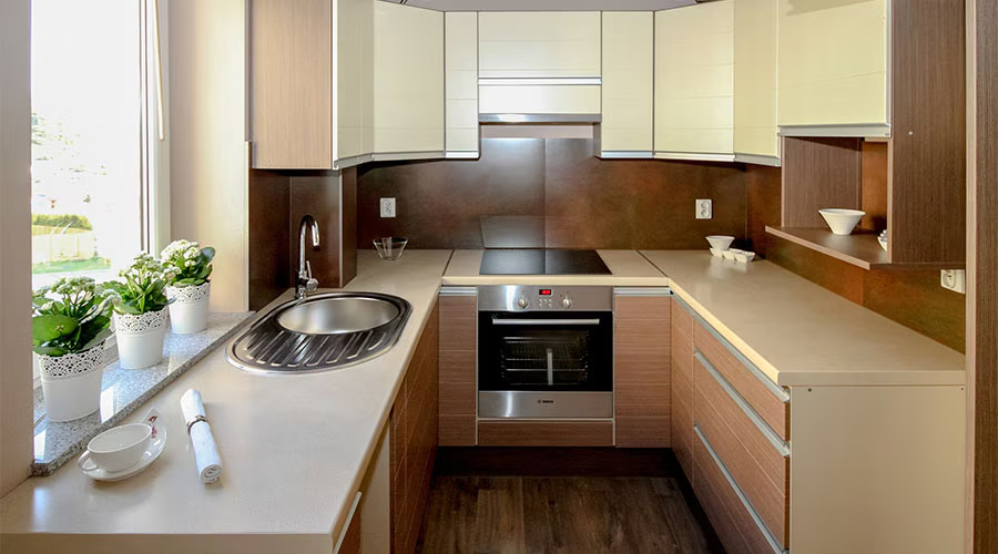 U字型の壁付けキッチンは、3方向を壁に囲まれたレイアウトで、作業台・シンク・コンロをバランスよく配置することが可能です。手の届く範囲にすべての機能が集まるため、効率重視の方にはぴったりのスタイルです。収納力も抜群で、調理器具や食材をスムーズに出し入れできます。